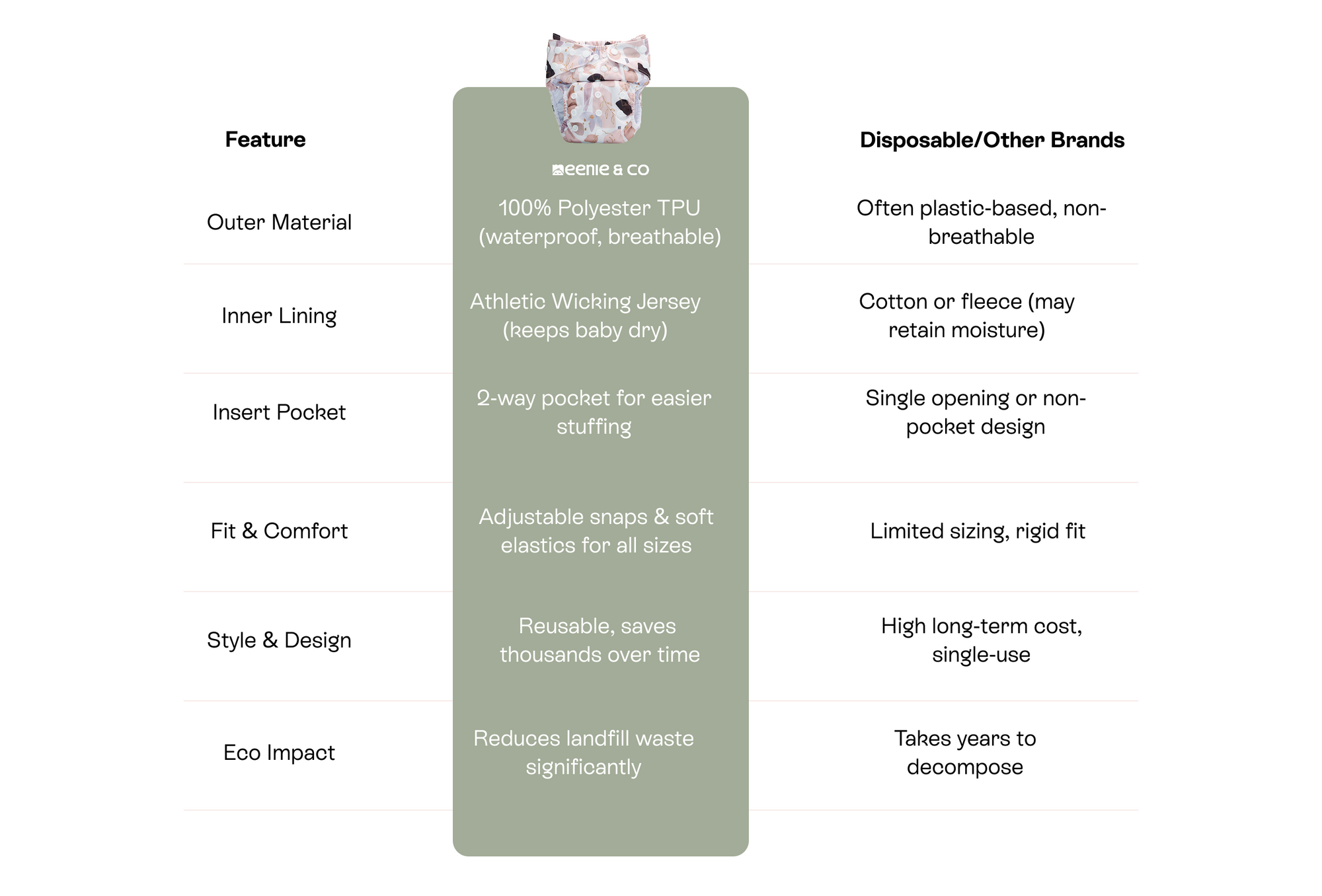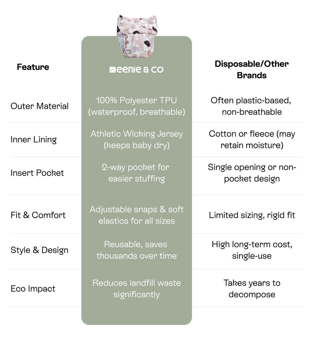 Introducing the new and improved Meenie & Co. 2.0 Cloth Diapers — thoughtfully redesigned with upgraded features to give your baby maximum comfort, protection, and style. We've taken feedback from real parents and made smart updates to make diapering even easier and more reliable.